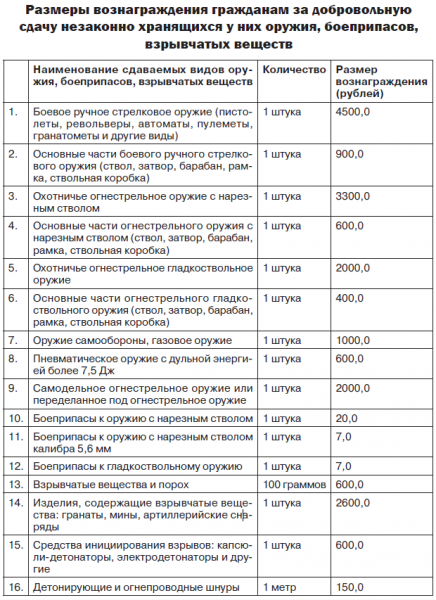 Лица, добровольно сдавшие оружие, боеприпасы, взрывчатые вещества и взрывные устройства, освобождаются от такой ответственности, и им выплачивается денежное вознаграждение.