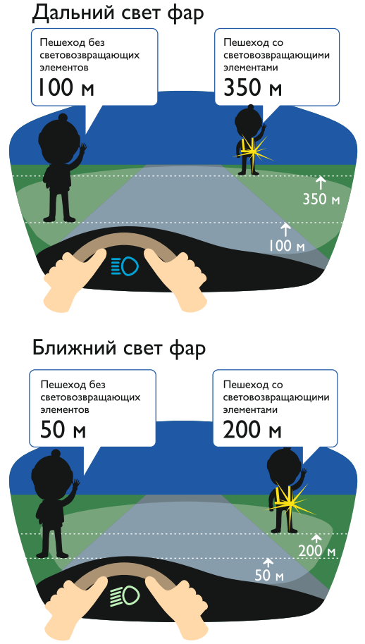При движении с ближним светом фар водитель автомобиля способен увидеть пешехода или велосипедиста на дороге на расстоянии 25-50 метров. Если пешеходы и велосипедисты применяют световозвращающие элементы, то это расстояние увеличивается до 150-200 метров. А при движении автомобиля с дальним светом фар дистанция, на которой пешеход или велосипедист становится виден, с применением световозвращателей увеличивается со 100 метров до 350 метров. Это даёт водителю 15-25 секунд для принятия решения.