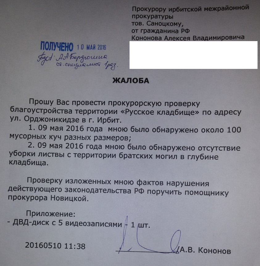 "9 мая в день Победы советского народа в ВОВ зафиксировал обстановку на видео, везде лежат большие кучи мусора, братскую могилу в центре кладбища никто не прибирал! У православных христиан 10 мая Родительский день, очень много людей пришло на кладбище, вот как так можно относиться к живым и мертвым!? 10 мая зарегистрировал в ирбитской межрайонной прокуратуре письменную жалобу. Пора решать эту проблему с бардаком, опыт 2015, 2014, 2013 г.г. главу МО г. Ирбит Г.А. Агафонова ничему не научил", - резюмировал Алексей Кононов.