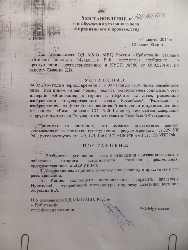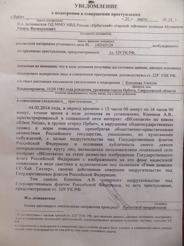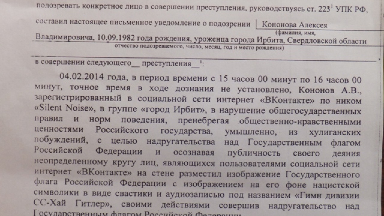 Уголовное дело по статье 329 УК РФ «Надругательство над Государственным гербом Российской Федерации или Государственным флагом Российской Федерации» возбуждено в отношении неизвестного лица, но главным подозреваемым по нему проходит активист из Ирбита Алексей Кононов. По версии полицейских, в феврале в группе «Ирбит» в соцсети «ВКонтакте» пользователь «Silent noise» (по данным полицейских, под этим ником скрывался Кононов) разместил изображение флага России с нарисованной на нем свастикой, аудиозапись с маршем дивизии СС, а также сравнил Россию по условиям жизни с Третьим рейхом. Администратором группы пост был удален, но о факте публикации записи стало известно сотрудникам правоохранительных органов, после чего было возбуждено уголовное дело в отношении неизвестного лица, скрывавшегося под ником «Silent noise».
