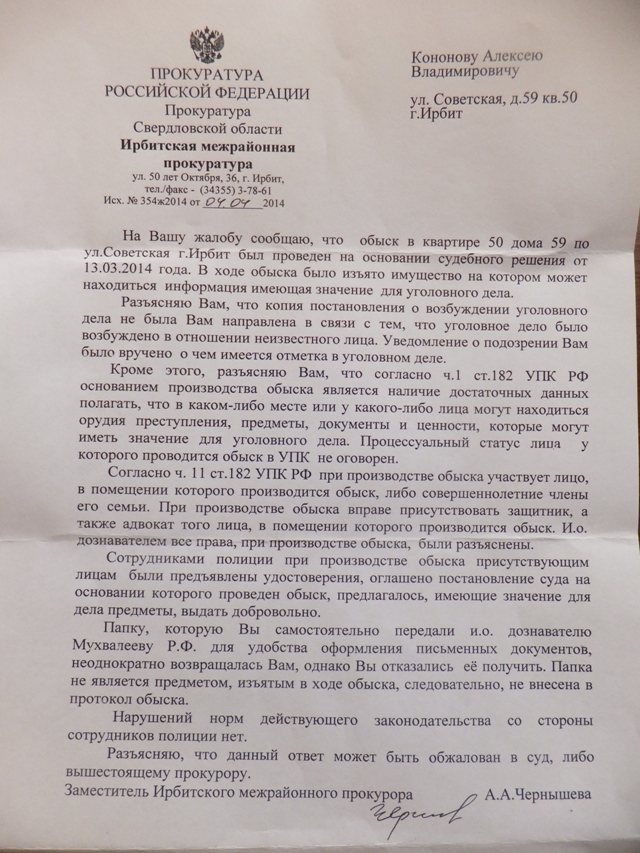 При этом в полиции Ирбита уверяют, что папку Кононов самостоятельно передал дознавателю «для удобства оформления письменных документов». По словам правоохранителей, папка неоднократно возвращалась молодому человеку, но он отказывался ее брать.