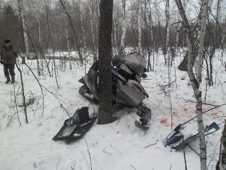05.04.2014 г. в 19:30 на территории лесного массива в районе деревни Чащина водитель снегохода, 1955 года рождения, с 15-летним стажем, не имея права на управление транспортным средством, не справился с управлением и въехал в дерево. В результате ДТП водитель получил закрытую черепно-мозговую травму, госпитализирован.