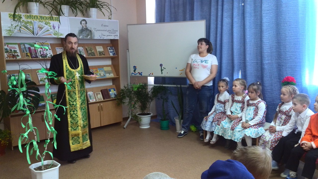 На Троицу шли в церковь с цветами и пахучими травами в руках. Внутри храм украшается березовыми веточками, цветами. Перед иконой «Троица» зажигают свечи. На праздник «Троицкие забавы» сотрудники библиотеки пригласили настоятеля храма Петра и Павла с. Ерзовка Ирбитского района отца Владимира Старикова, который познакомил ребят с историей праздника.