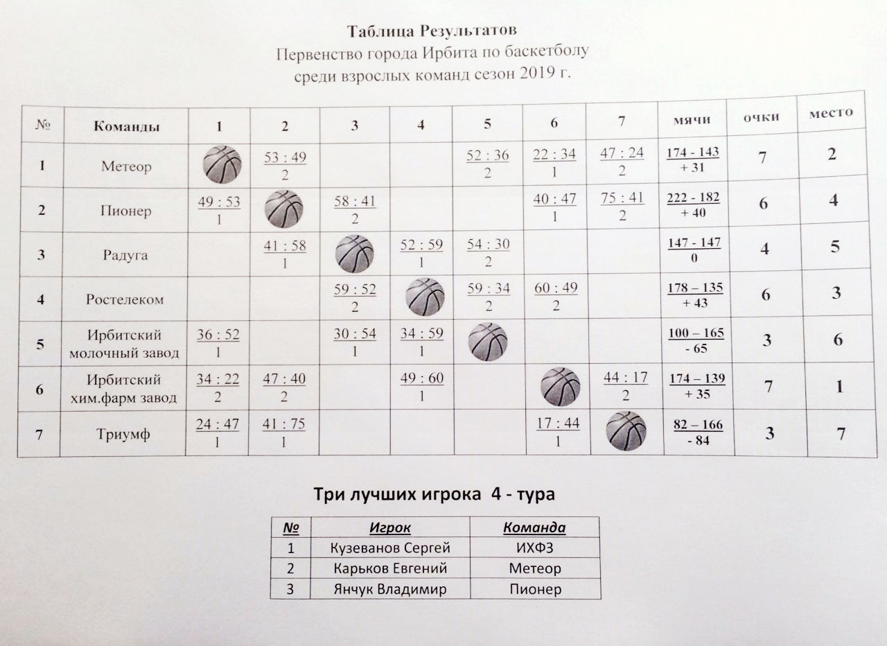 В четвертом туре «Ростелеком» со счетом 59:34 одержал победу над «Ирбитским молочным заводом», «Пионер» выиграл со счетом 75:41 команду «Триумф», «Ирбитский химико-фармацевтический завод» (ИХФЗ) обыграл «Метеор» со счетом 34:22.