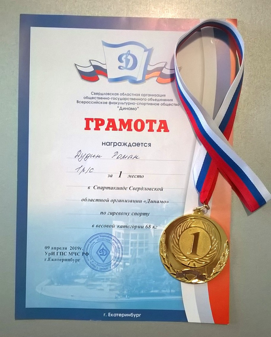 9 апреля 2019 года на площадке Уральского института ГПС МЧС России состоялось первенство Свердловской областной организации «Динамо» по гиревому спорту 2019г. Ирбитчанин Дудин Роман в весовой категории до 68 кг с гирями весом 24 кг с результатом в сумме 182 очка занял первое место: толчок - 75, рывок - 214 подъемов. Этот весомый вклад Романа привел к тому, что команда 1-го райсовета, за которую выступал спортсмен, уверенно заняла 1-е общекомандное место.