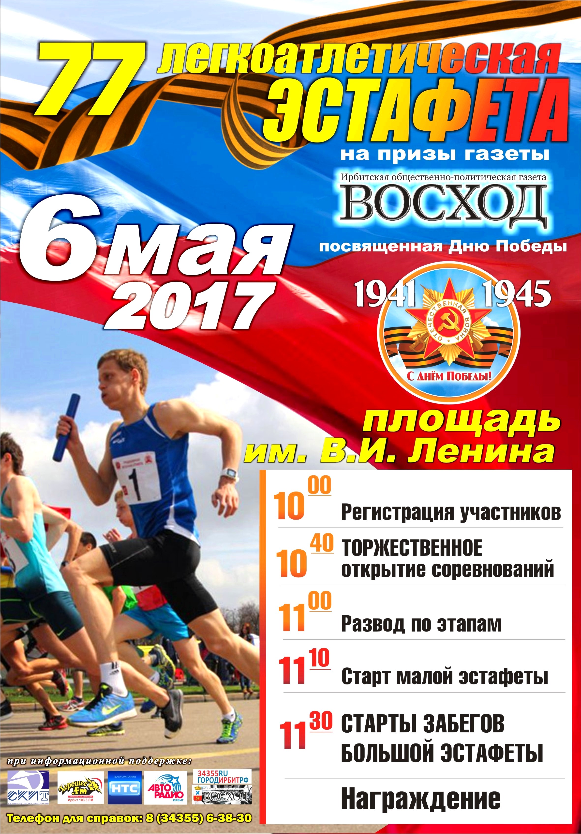 77-я традиционная легкоатлетическая эстафета на призы газеты «Восход», посвященная Дню Победы в Великой Отечественной войне пройдет в Ирбите 6 мая 2017 года. «Старт - финиш» эстафеты – на площади имени Ленина. Маршрут легкоатлетической эстафеты пройдет по улицам города: улица Ленина, Красноармейская, Первомайская, 50 лет Октября, Советская, Кирова. Как и прежде, маршрут эстафеты протяженностью более 4 км разобьют на 12 этапов. В настоящее время идет работа по подготовке эстафеты.