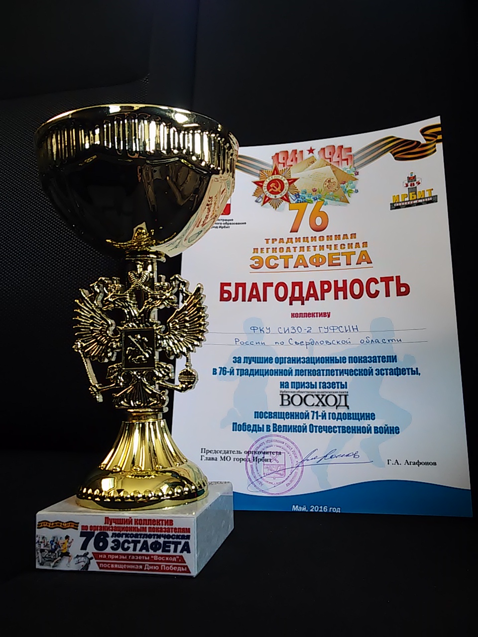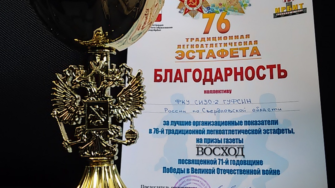 За лучшие организационные показатели в 76-ой легкоатлетической эстафете на призы газеты "Восход", посвященной 71-й годовщине Победы в Великой Отечественной войне", СИЗО-2 ГУФСИН России по Свердловской области была объявлена благодарность и вручен кубок.
