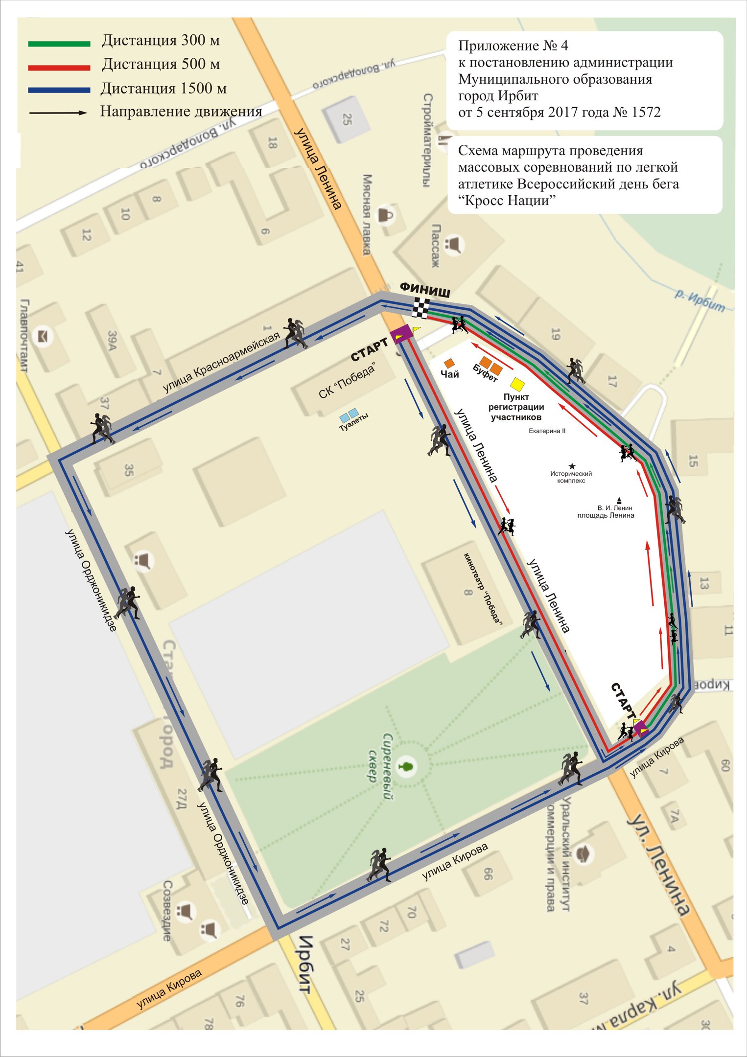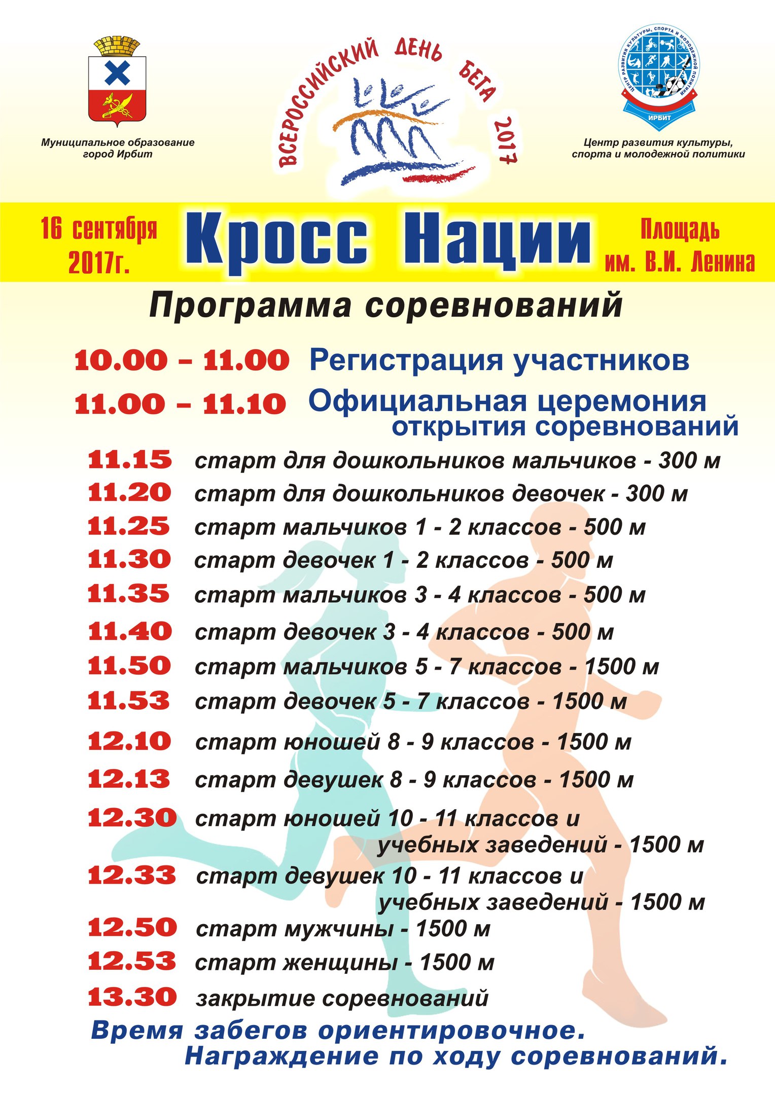 Всероссийский день бега «Кросс нации - 2017» пройдет в Ирбите 16 сентября. Местом проведения станет площадь им. В.И Ленина. В связи с этим в день массового забега с 11:00 до 14:00 профильные службы ограничат движение всех видов транспорта по улице Красноармейская (от ул. Ленина до ул. Орджоникидзе), по улице Орджоникидзе (от ул. Красноармейской до ул. Кирова), по улице Кирова (от ул. Орджоникидзе до ул. Ленина), по улице Ленина (от ул. Кирова до ул. Красноармейская). Церемония открытия соревнований начнется в 11.00.