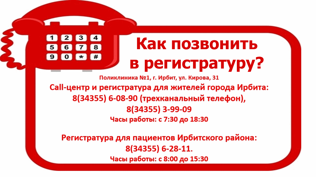 Регистратура детской поликлиники: г. Ирбит, ул. Советская, 35, 8(34355) 6-22-30, 8(34355) 6-25-99
