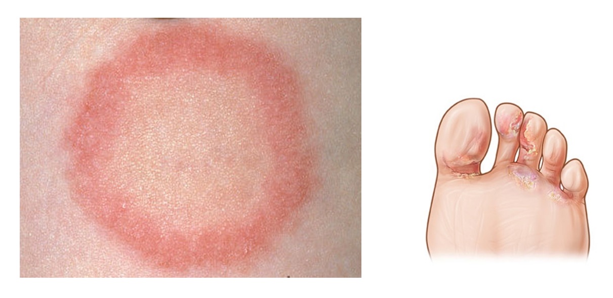 Наиболее распространенным видом дерматомикоза является эпидермофития стопы, при которой наблюдается поражение кожи на ногах между пальцами. Заболевание выражается в покраснении, зуде и растрескивании кожи. В данном случае инфекция может распространиться на ногтевую пластину (дерматофития ногтей) и может также поражать кожу и ногти рук.
